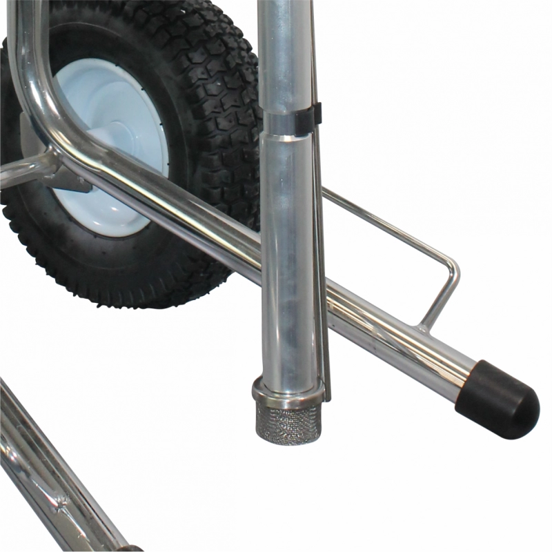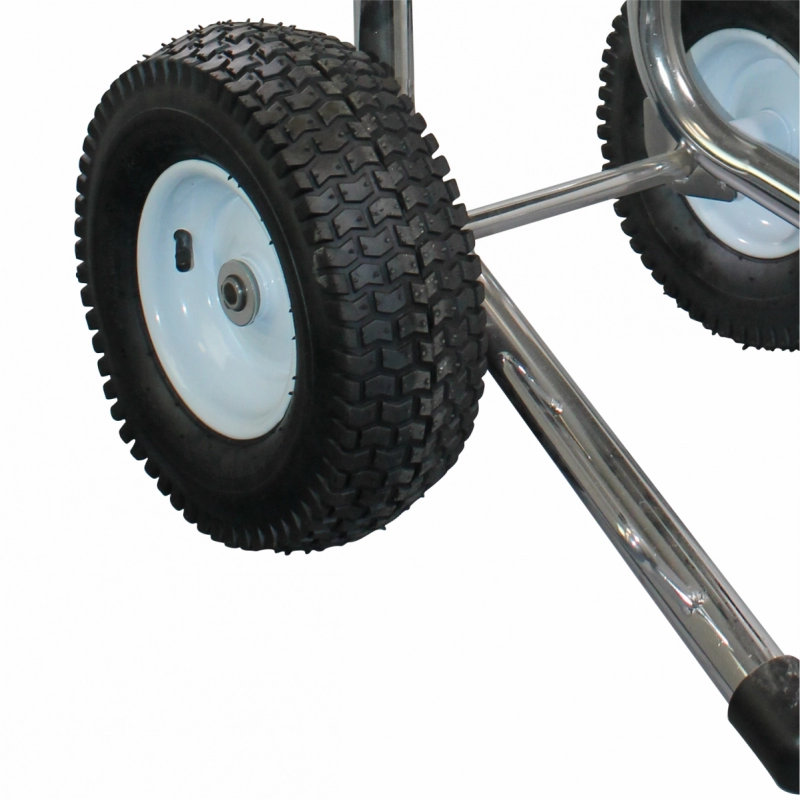 Cadrul metalic rezistent și roțile pneumatice de mari dimensiuni permit deplasarea echipamentului pe orice tip de suprafață. Mânerul cu suport integrat pentru furtun menține organizarea pe timpul lucrului.