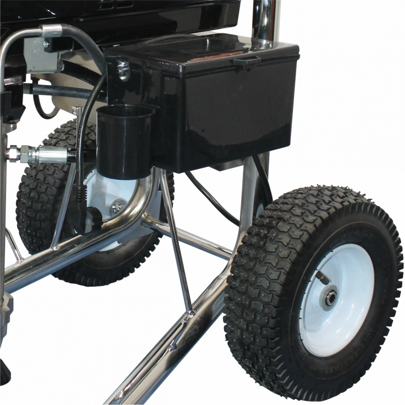 Cadrul robust este montat pe cărucior cu roți pneumatice pentru deplasare ușoară. Mânerul integrat include suport dedicat pentru furtun, facilitând organizarea pe durata lucrărilor.