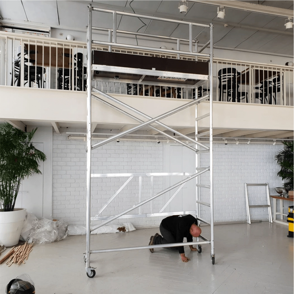 Cadrul din aluminiu asigură durabilitate fără a adăuga greutate inutilă. Cu 63 kg greutate totală, schela poate fi repoziționată mai ușor în condiții normale de șantier. Podina de 5 cm oferă o suprafață fermă și stabilă pentru utilizator și unelte.